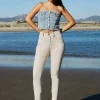 Jeans Palm Spring de calce perfecto para acentuar tus curvas y realzar tu figura. Ajuste de cintura alta, tela elastic denim, tejido suave con un nivel justo de elasticidad para dar forma y comodidad resaltando tu figura, calce efecto push up con dos pinzas para crear una forma redondeada y realzar glúteos, con pretina para 1 botón, va de la talla 36 a talla 50. Bota suelta. Largo normal. Color arena.
